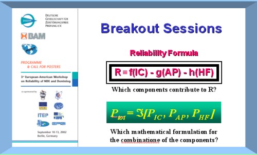 ASNT & DGZFP Reliability Committee status Schaefer inquired as to the current level of effort and prognosis for the ASNT reliability committee effort Sharon Vukelich and Christina Mueller provided status. There is a recognition of need to address it. 10 years ago, it was rejected as a "Standards" activity, and had perhaps objectionable implications for the membership and existing certification programs. The initial response to this posture of 10 years ago was that ASTM created a performance demonstration section related to its specific needs. Ripi Singh suggested that to avoid this problem that the primary influence be retained on testing system reliability, and muting the focus on individual inspector certification. While inherently problematic, such as in penetrant inspection, qualifying the inspector group capability as input to the design or lifing customer is a feasible work around. All agreed that the focus should be on testing the "process" vs the individual. Within ASNT board, both past president Doggert, and also Mike Turnbow supported the concept of a committee for NDE reliability. To date ASNT committee is active, but have held only one meeting With support of a neutrally located and focused NDE reliability web, knowledge of specimen and POD assessment resources and results will help germinate essentials which will lead towards understanding of global reliability by process, and identification of Critical to Quality elements which influence the results. DGZfP had terminated its reliability committee, however, current president Jorge Volker will re-form this committee and champion the importance of acquiring and delivering this knowledge to customers.
