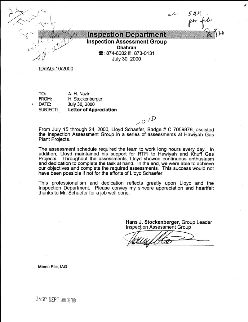 Saudi-Aramco Recognition for performance on Supplier Quality Audits. Here the challenge was to ensure the customer requirements were being implemented according to the procurement contracts, and in compliance with all company, industry and regulatory requirements. On-site audits required successful communication and rapport with suppliers from the; SA peninsula, Italy, Japan, Great Brittan & the USA