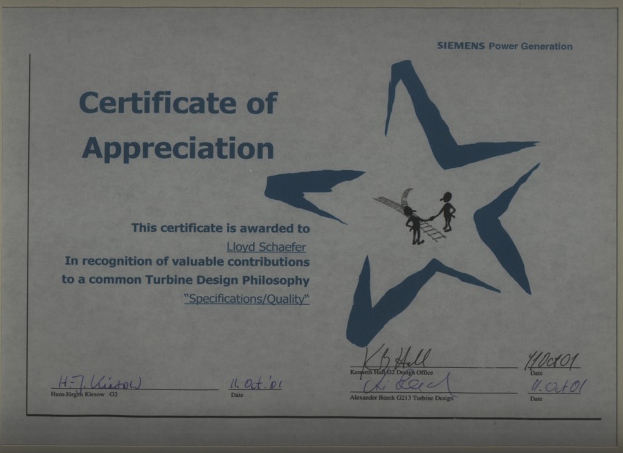 Recognition from Siemens Westinghouse for contributions to a new common philosophy for the next generation Industrial Gas Turbine design. The principal challenge was to develop consensus for a Quality Engineering philosophy in the newly merged company. Success was achieved through leadership of the design philosophy team, creating consensus from the very diverse perspectives of the German and America QE teams. This effort resulted in the successful creation of a new joint set of command media which satisfied the CTQs for the new global organization